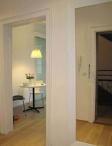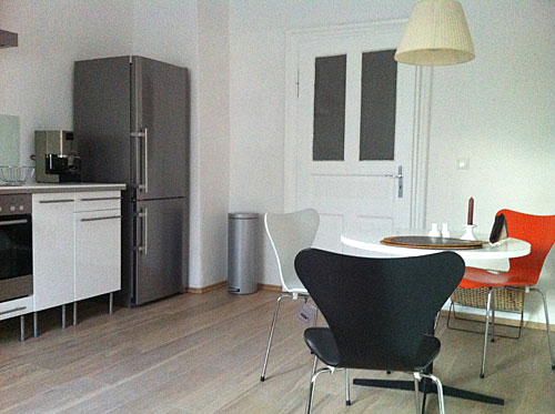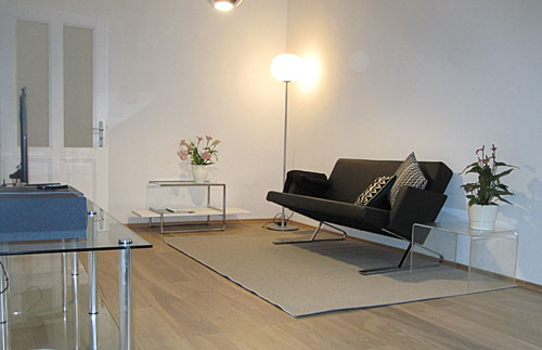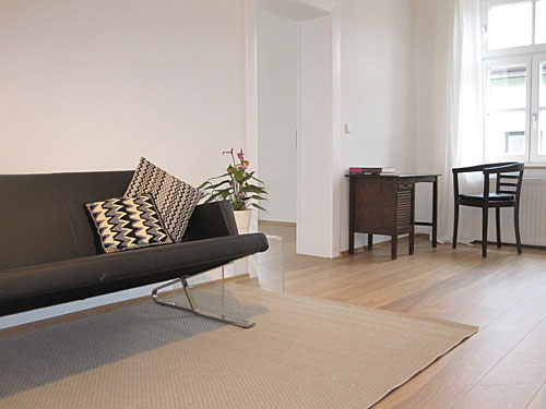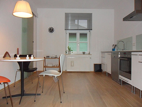 Gehoben-stylisch-jung. Wohnküche: EBK, Siemens Elektrogeräte - Kühlschrank mit Gefrierfach, Geschirrspüler, Ceran-Herd, Ofen, Mikrowelle, Kaffemaschine, Wasserkocher, Toaster, Geschirr und Besteck; Esstisch, Stühle… Bad :luxuriös, Badewanne, Dusche, Badetuchwärmer, Waschmaschine, Badetücher. Wohnzimmer: Flat-Screen, Hi-Fi mit Docking Station, DVD Player, neue Designer Möbel (Classicon, Einrichtung, Lambert, Foscarini...) Schlafzimmer: Kleiderschrank Interlübke, Bett 2x2m, Bettwäsche.