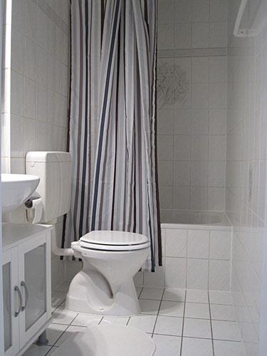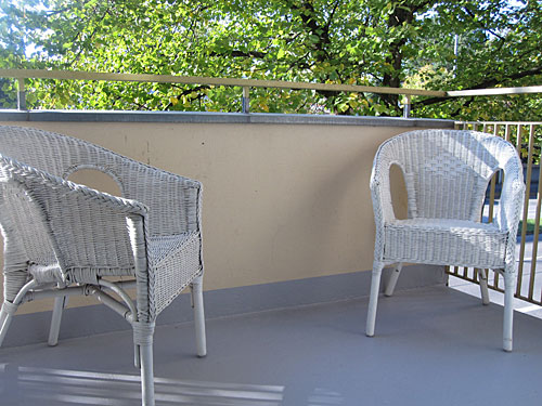 Bad: Spiegelschrank, Badewanne, Waschbecken und ein Waschbeckenunterschrank. Balkon: 2 Sessel.