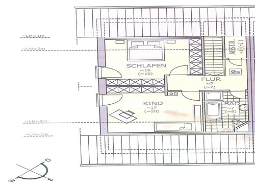 Die DG-Spitze ist über 3 m hoch und die Schrägen fangen erst bei einer Höhe von einem Meter an. Deshalb wirkt das gesamte DG ausgesprochen luftig. Viele Naturlichtquellen verleihen den Räumen im Dachgeschoss einen besonderen Charme. In der sehr hohen Diele unter dem Dachgiebel (ca. 7qm) gibt es viel Platz und ausreichende Staumöglichkeiten. Separat steht Ihnen auch noch ein ca. 1 qm großer Abstellraum im DG zur Verfügung. Im Kinderschlafzimmer ist ebenfalls ein großer Abstellraum in die Schräge integriert.